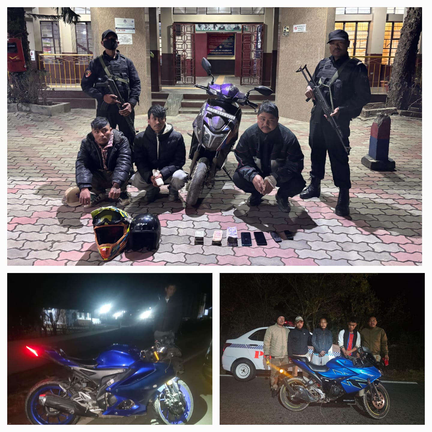 After pursuing one bike theft gang for the past few weeks, in a well coordinated effort by Sohra PS and Special Cell EKH, two bike thieves namely, Babu Marak 19yrs of Dalia Shella and Sunday N. Sangma 30 yrs of Samanda EGH were intercepted yesterday evening at Sohra Rim in a Suzuki Gixer bike ML 05 AD 4393, stolen from Smit, to be sold to receivers from Bangladesh. They had received the bike in Mawkdok from another group who are involved in lifting bikes from the city. In a follow up operation, three persons who stole the bike and involved in umpteen number of bike cases were arrested in 7th Mile EKH with a scooty , namely Shri Barabor Namsaw(28), r/o Jirang, Patharkhmah, Shri Banroilang Iawrod(19) r/o Kynbahmalai, Phlangwambroi Mawsynram and Shri Declin Warjri(20)r/o Nongmensong Shillong. While continuing with the checking at Sohra, another bike stolen on 23.02.25 morning from Mawiong Umjapung , an R15 ML05AA 3297 stopped ahead of the checking at Nongsawlia, abandoned the bike and escaped. The accused are being produced under Madanrting PS Case No 31(02)25 u/s 303(2) BNS