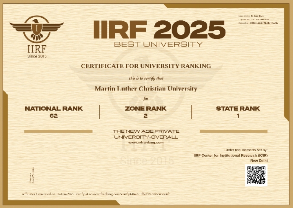Martin Luther Christian University (MLCU) is proud to announce its exceptional performance in the 2025 Indian Institutional Ranking Framework (IIRF). The university has earned distinguished positions both regionally and nationally, being ranked: • 1st among private universities in Meghalaya • 2nd among private universities in the Northeast region • 62nd among private universities in India With this, MLCU has emerged as the highest-ranked private university in Northeast India, placing it firmly among the top 100 universities nationwide. This recognition reflects the university’s growing reputation for academic excellence, innovation, and its commitment to producing graduates aligned with workforce needs. The IIRF 2025 rankings are based on a comprehensive assessment across parameters such as academic strength, research output, industry engagement, placement performance, and overall institutional perception. Over 2,500 institutions, including more than 500 private universities, were evaluated nationwide. Founded in 2005, MLCU has consistently championed an inclusive, student centered approach to education. The university continues to play a vital role in shaping skilled, compassionate professionals who contribute meaningfully to society. About IIRF The Indian Institutional Ranking Framework (IIRF) is one of the most respected higher education rankings in India, conducted by Education Post. It serves as a key reference for students, parents, and institutions looking for academic excellence and industry relevance. For full rankings, visit: https://iirfranking.com/ranking/top-universities-in-india