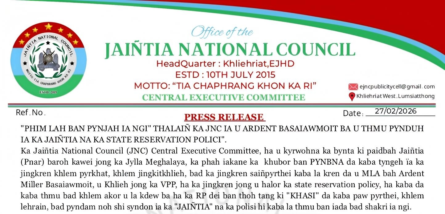 The JNC cautioned political leaders against reducing community identities to electoral rhetoric and warned against any attempt to dilute or undermine institutions such as the Jaiñtia Hills Autonomous District Council.